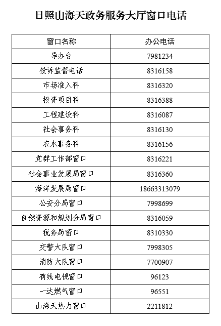 日照山海天區(qū)政務(wù)服務(wù)中心網(wǎng)上辦事大廳各部門咨詢電話,日照市公安局山海天旅游度假區(qū)分局辦事大廳窗口咨詢電話:0633-7998699