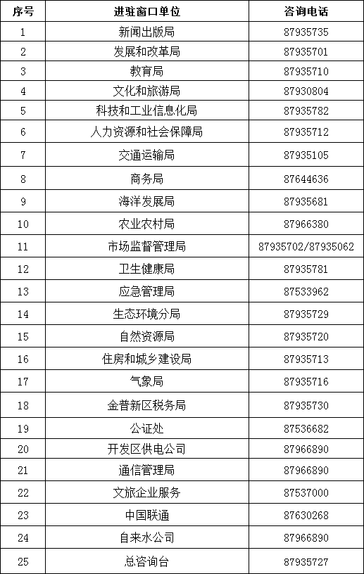 大連金普新區(qū)政務(wù)服務(wù)中心總咨詢臺(tái)電話:0411-87935727,金普新區(qū)市場(chǎng)監(jiān)督管理局窗口電話:0411-62898707