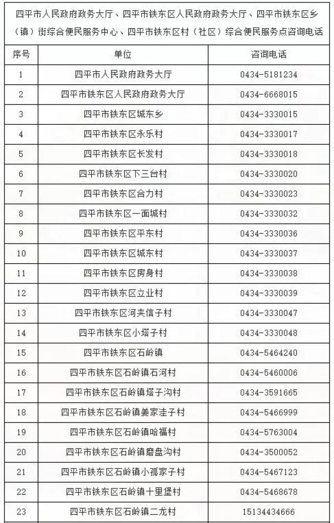 為進一步強化為民服務(wù)意識、暢通為民服務(wù)渠道,滿足廣大人民群眾的辦事需求,提高為民辦事效率,打通市、區(qū)、鄉(xiāng)鎮(zhèn)、村社區(qū)四級便民服務(wù)網(wǎng)絡(luò),切實做好解民憂、惠民生、凝民心、聚民力工作,現(xiàn)將四平市人民政府政務(wù)大廳、四平市鐵東區(qū)人民政府政務(wù)大廳、四平市鐵東區(qū)鄉(xiāng)(鎮(zhèn))街綜合便民服務(wù)中心、四平市鐵東區(qū)村(社區(qū))綜合便民服務(wù)點咨詢電話進行公示(見下表)。