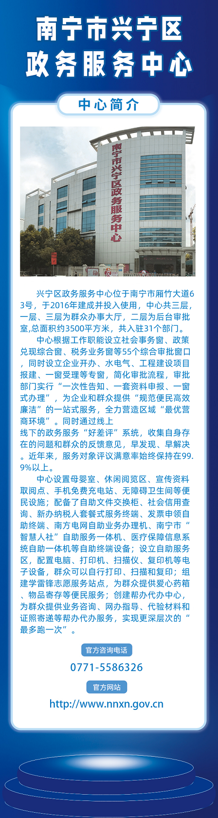 南寧市興寧區(qū)政務(wù)服務(wù)中心以“便民、高效、公開、公正”為宗旨,以“部門圍著窗口轉(zhuǎn)、窗口圍著群眾轉(zhuǎn)”為原則,以服務(wù)城區(qū)經(jīng)濟(jì)發(fā)展為核心,以人民群眾滿意為標(biāo)準(zhǔn),進(jìn)一步簡(jiǎn)化審批程序,提高行政效率,為群眾提供方便快捷、優(yōu)質(zhì)高效的服務(wù)。