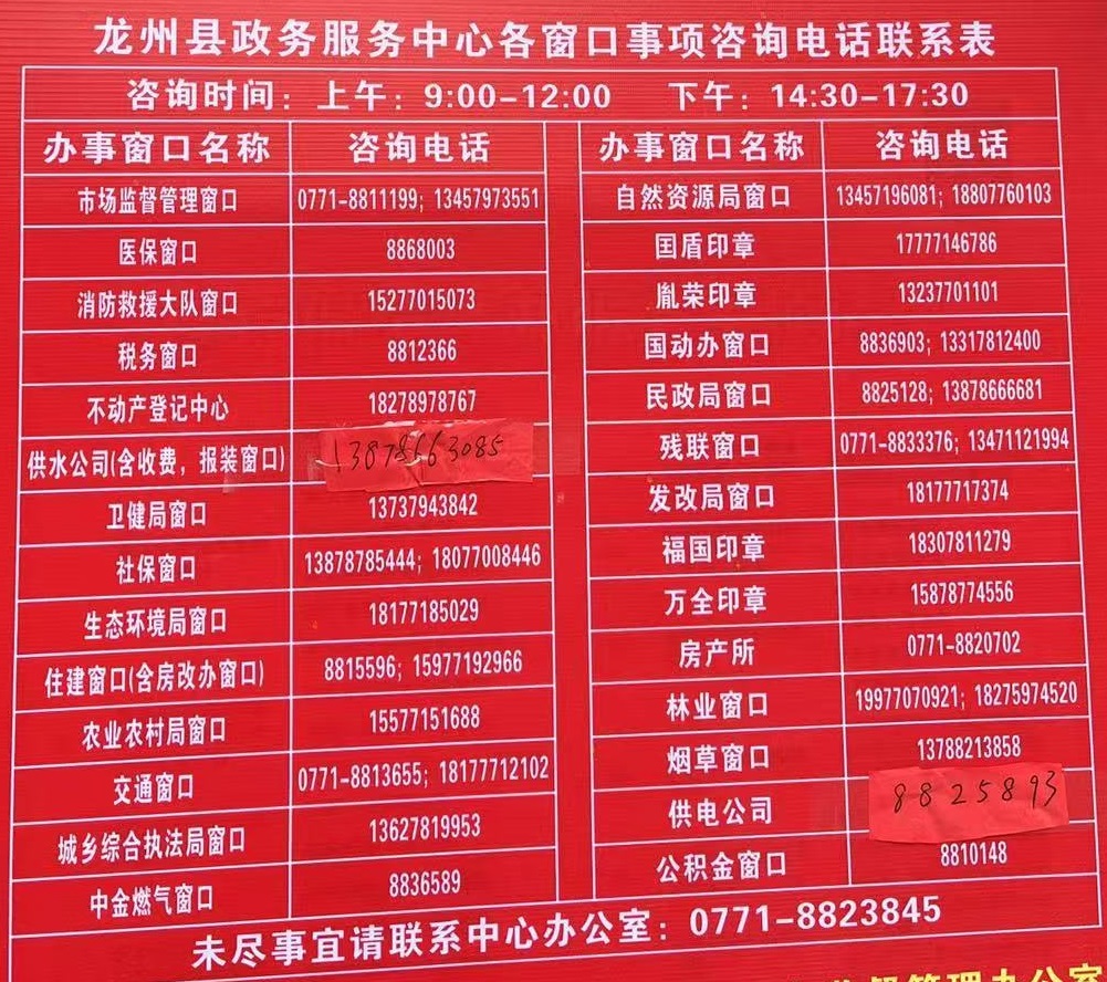 辦公地址:廣西壯族自治區(qū)崇左市龍州縣龍州鎮(zhèn)興仁街127號(hào)龍州縣政務(wù)服務(wù)中心