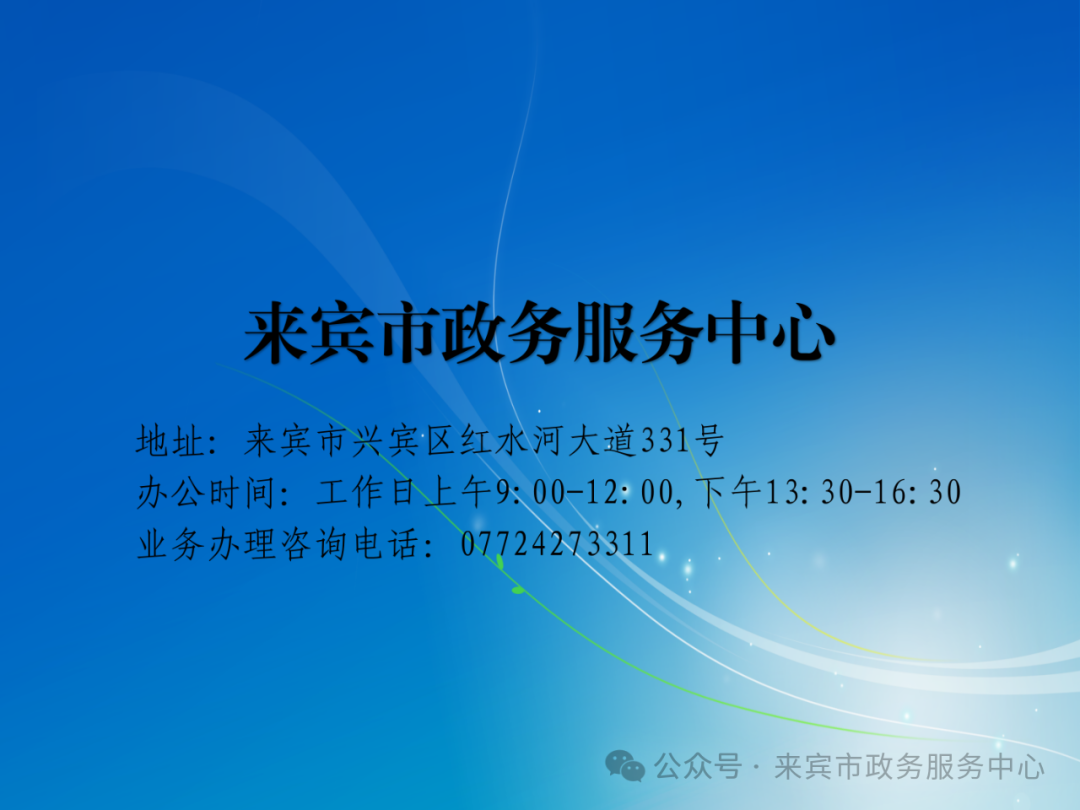 來賓市政務(wù)服務(wù)中心辦事大廳稅務(wù)局窗口咨詢電話:0772-4270019;0772-4272919;市場監(jiān)管局窗口咨詢電話:0772-4276911;自2020年3月5日(星期四)上午9時起全面恢復(fù)市政務(wù)服務(wù)中心現(xiàn)場業(yè)務(wù)辦理,對外辦公時間為每個工作日上午9:00?12:00,下午13:30?16:30。