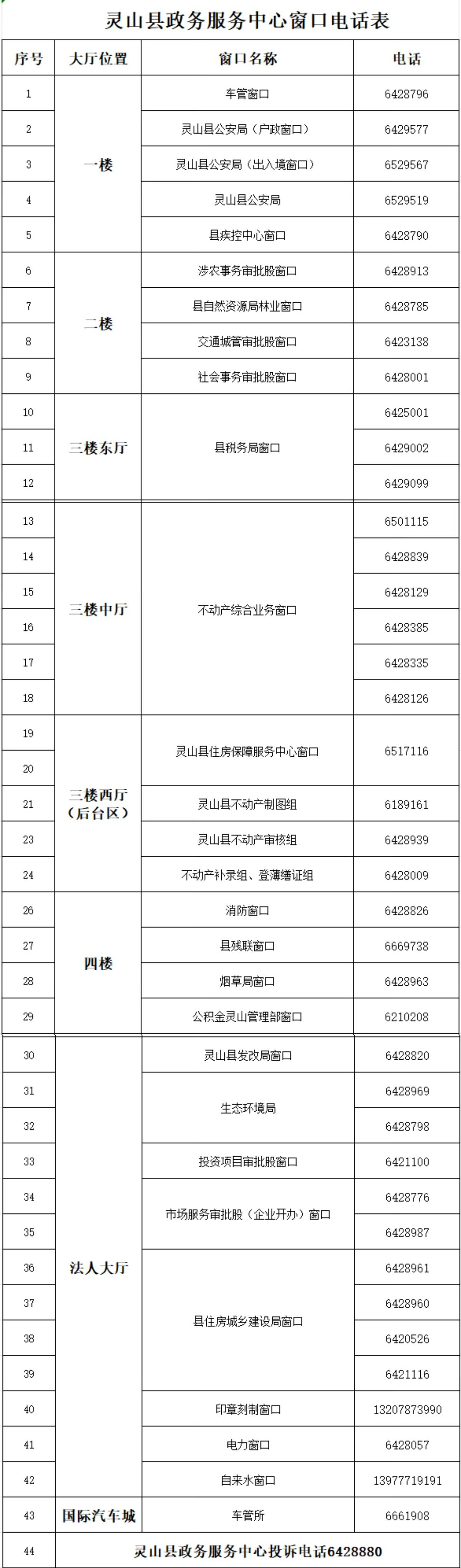 靈山縣政務(wù)服務(wù)中心辦事大廳車管窗口咨詢電話:6428796;疾控中心(駕駛證體檢)窗口:6428790;公積金窗口:6210208;煙草窗口:6428963;消防窗口:6428826
