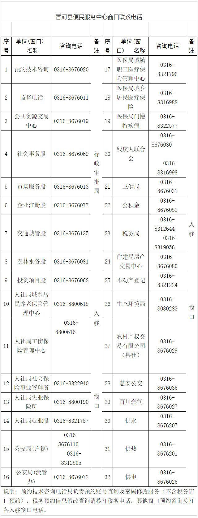 香河縣便民服務(wù)中心辦事大廳窗口聯(lián)系電話;預(yù)約技術(shù)咨詢電話:0316-8676020;企業(yè)注冊(cè)股咨詢電話:0316-8676077