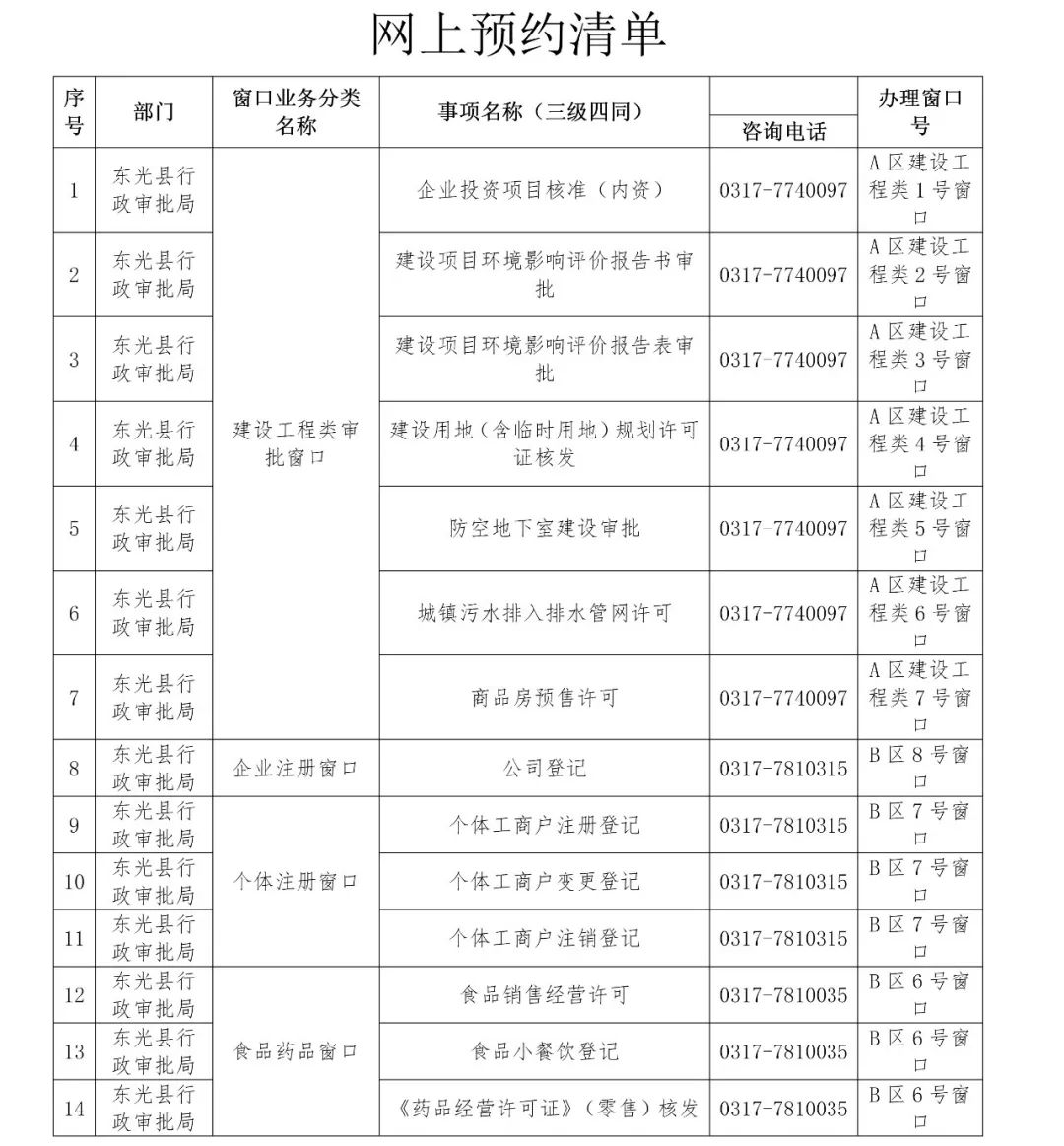 東光縣行政審批局(政務(wù)服務(wù)中心)辦事大廳辦理時間:星期一至星期五:秋冬春季(10月1日~7月14日)上午9:00~12:00,下午13:30~17:30;夏季(7月15日~9月30日)上午9:00~12:00,下午14:00~17:30. 法定節(jié)假日除外。辦理地點:東光縣東升路政務(wù)服務(wù)中心;交通指引:縣內(nèi)乘坐1路、2路、3路公交車信合商廈下車北行50米