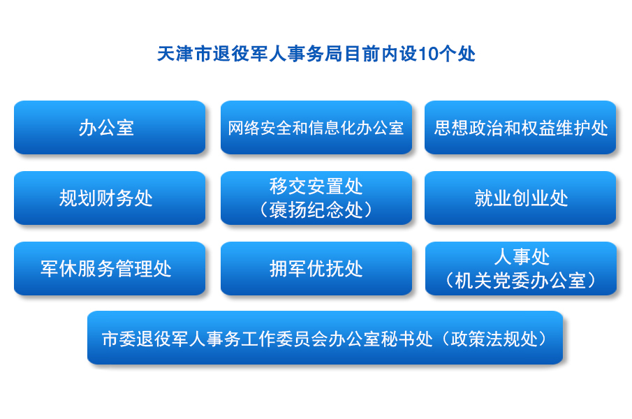 ? 將天津市民政局的退役軍人優(yōu)撫安置職責(zé),市人力資源和社會(huì)保障局的軍官轉(zhuǎn)業(yè)安置職責(zé)等整合,組建市退役軍人事務(wù)局,作為市政府組成部門。