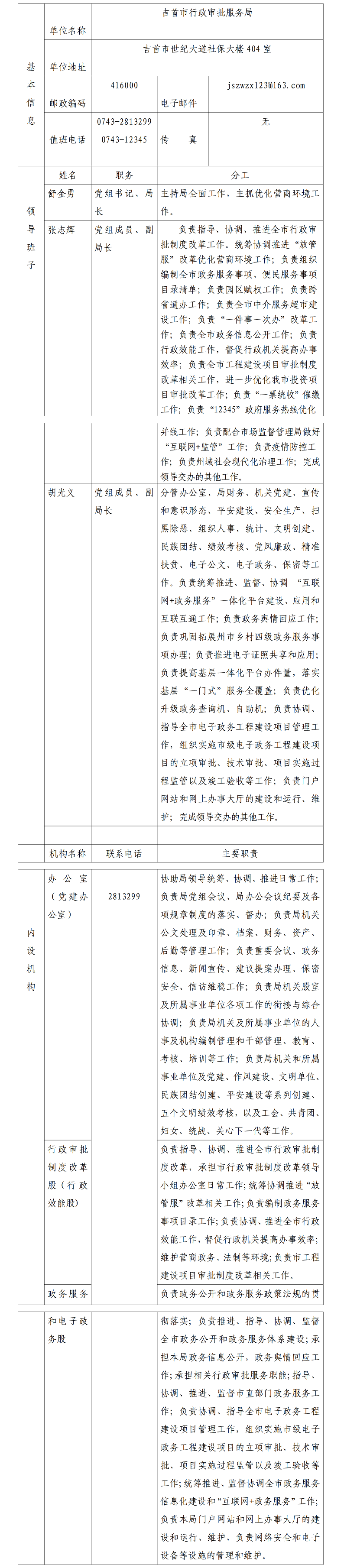 內(nèi)設(shè)機(jī)構(gòu)設(shè)置 吉首市行政審批服務(wù)局內(nèi)設(shè)科室3個,分別為:辦公室、行政審 批制度改革股、政務(wù)服務(wù)和電子政務(wù)股。