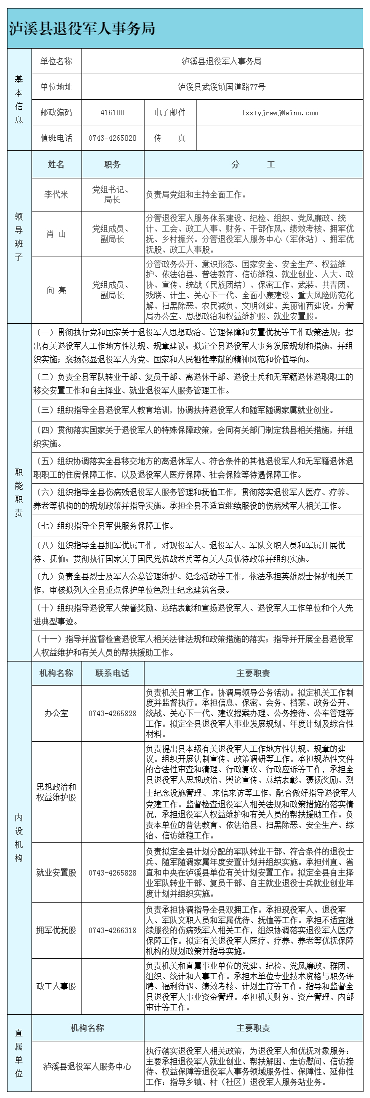 瀘溪縣退役軍人事務(wù)局內(nèi)設(shè)機(jī)構(gòu)5個(gè)分別為:1、辦公室2、思想政治和權(quán)益維護(hù)股3、就業(yè)安置股4、擁軍優(yōu)撫股5、政工人事股。