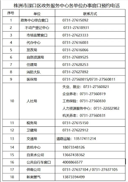 株洲市淥口區(qū)政務服務中心各單位辦事窗口預約電話;政務中心綜合窗口咨詢電話:0731-27615092;公安窗口咨詢電話:0731-27621778;不動產登記中心咨詢電話:0731-27618931;市場監(jiān)管窗口咨詢電話:0731-27623333