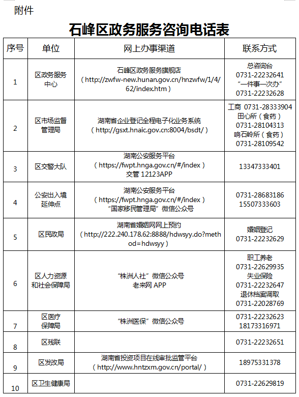 株洲市石峰區(qū)政務(wù)服務(wù)中心總咨詢臺(tái)0731-22232641“一件事一次辦”、跨省(域)通辦0731-22232628