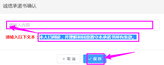 接下來是誠信承諾書確認,填寫以下文本(標點符號都不能錯),然后點擊【保存】按鈕: