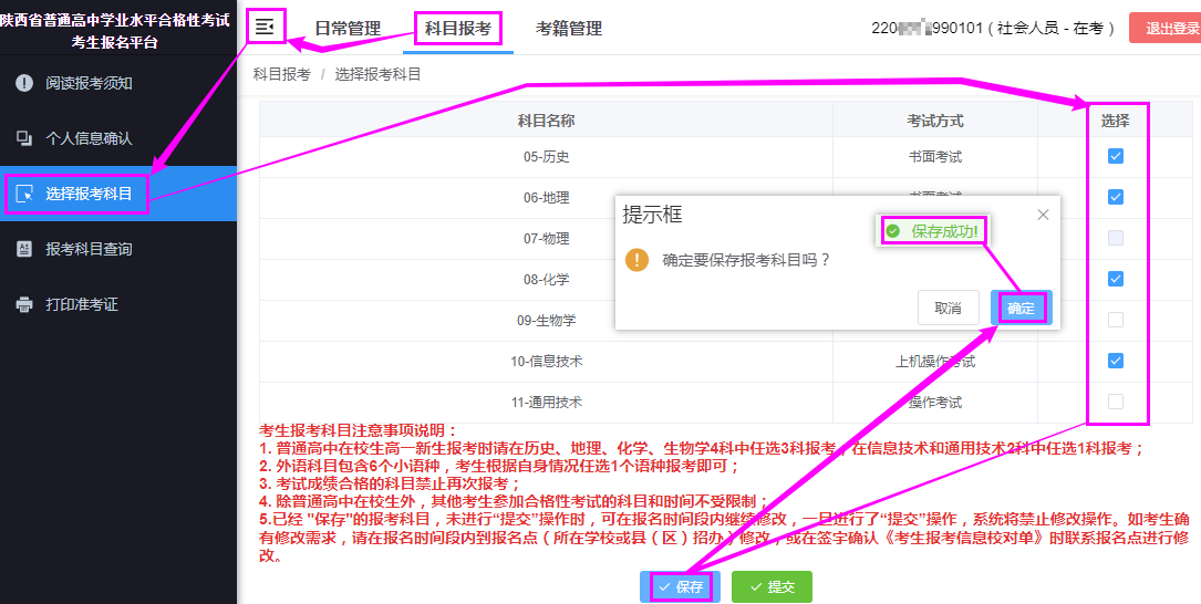 →【選擇報考科目】→勾選這次報考科目→點擊【保存】按鈕;