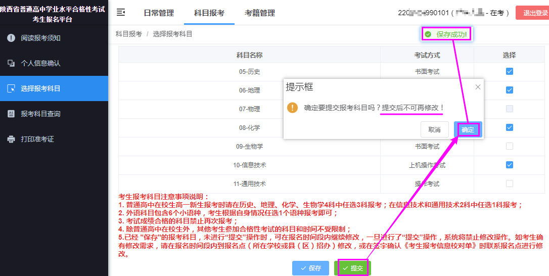 4.一旦【提交】,系統(tǒng)將禁止更改報考科目。