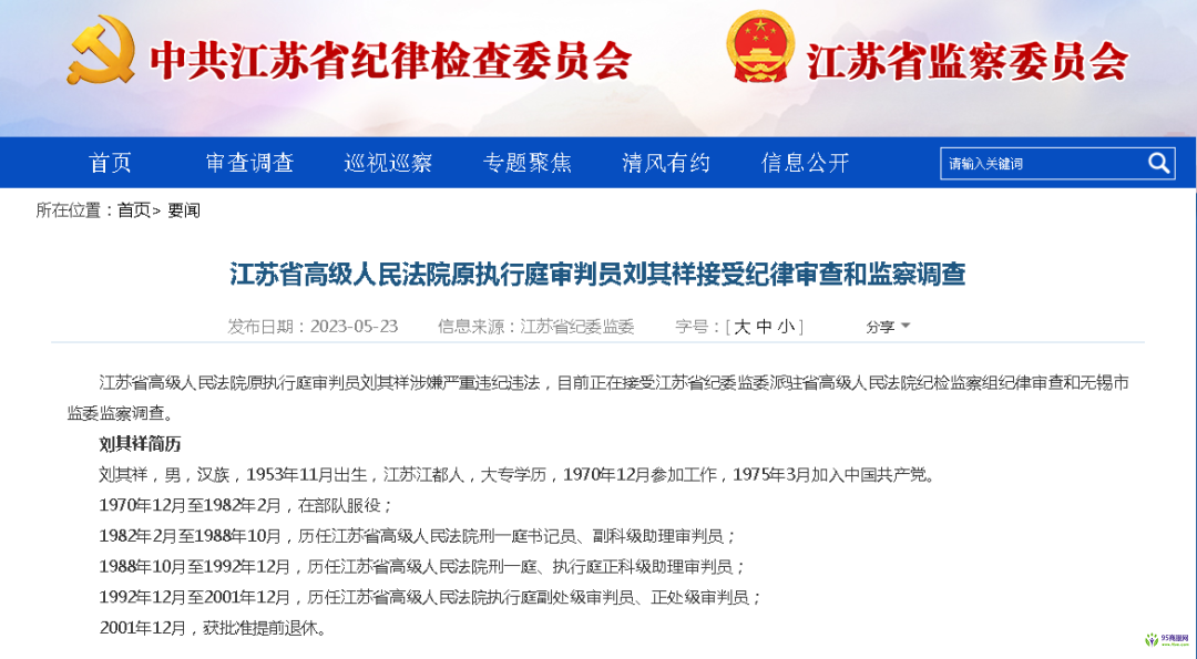 2023年5月,劉其祥涉嫌嚴(yán)重違紀(jì)違法,目前正在接受江蘇省紀(jì)委監(jiān)委派駐省高級(jí)人民法院紀(jì)檢監(jiān)察組紀(jì)律審查和無錫市監(jiān)委監(jiān)察調(diào)查。