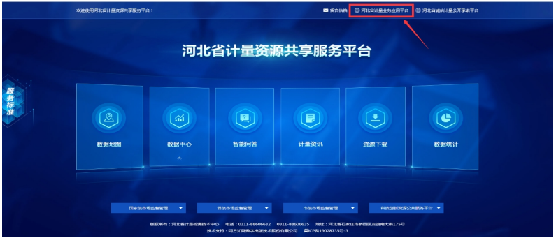 登陸:https://www.hebjlzy.com,進(jìn)入“河北省計量資源共享服務(wù)平臺“頁面,點擊頁面右上側(cè)【河北省計量業(yè)務(wù)應(yīng)用平臺】即