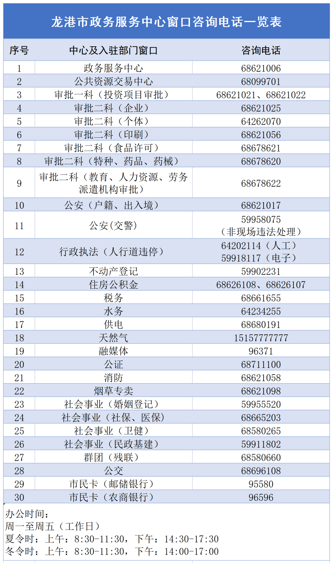 龍港市政務(wù)服務(wù)中心部分窗口業(yè)務(wù)咨詢(xún)電話