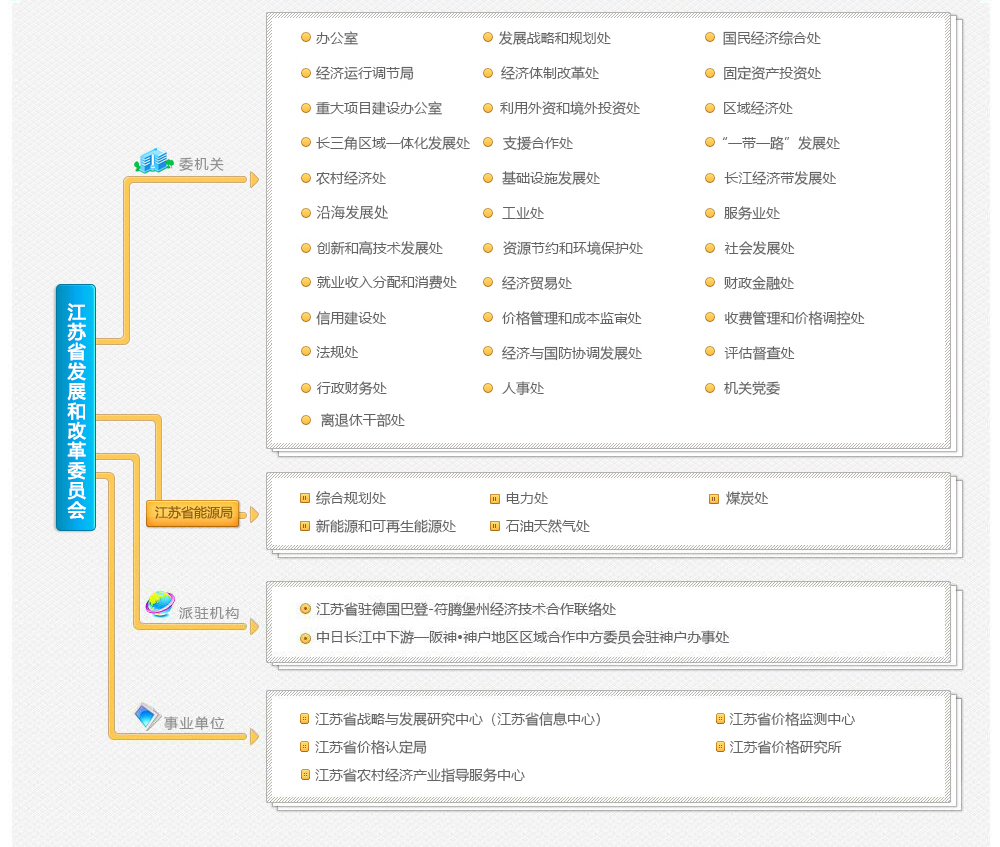 辦公室、發(fā)展戰(zhàn)略和規(guī)劃處(省規(guī)劃落實(shí)推進(jìn)工作辦公室)、國(guó)民經(jīng)濟(jì)綜合處(政策研究室)、經(jīng)濟(jì)運(yùn)行調(diào)節(jié)局、經(jīng)濟(jì)體制改革處、固定資產(chǎn)投資處、重大項(xiàng)目建設(shè)辦公室、利用外資和境外投資處、區(qū)域經(jīng)濟(jì)處(蘇北發(fā)展處)、長(zhǎng)三角區(qū)域一體化發(fā)展處、支援合作處、“一帶一路”發(fā)展處(國(guó)際合作處)、農(nóng)村經(jīng)濟(jì)處、基礎(chǔ)設(shè)施發(fā)展處(鐵道處)、長(zhǎng)江經(jīng)濟(jì)帶發(fā)展處、沿海發(fā)展處、工業(yè)處、服務(wù)業(yè)處、創(chuàng)新和高技術(shù)發(fā)展處、資源節(jié)約和環(huán)境保護(hù)處、社會(huì)發(fā)展處、就業(yè)收入分配和消費(fèi)處、經(jīng)濟(jì)貿(mào)易處、財(cái)政金融處、信用建設(shè)處(省自然人信用管理局)、價(jià)格管理和成本監(jiān)審處、收費(fèi)管理和價(jià)格調(diào)控處、法規(guī)處(行政審批處)、經(jīng)濟(jì)與國(guó)防協(xié)調(diào)發(fā)展處、評(píng)估督查處、行政財(cái)務(wù)處(審計(jì)處)、人事處、機(jī)關(guān)黨委、離退休干部處。