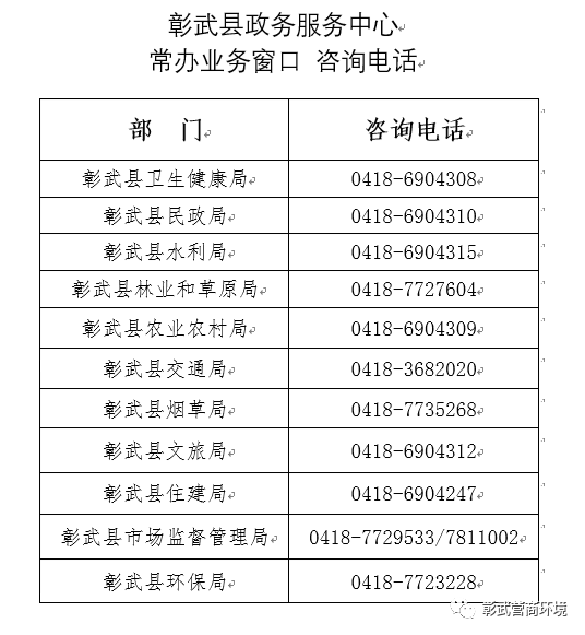 彰武縣政務(wù)服務(wù)中心綜合業(yè)務(wù):咨詢電話:0418-6915087 ;商事議事(市場局):咨詢電話:0418-?7729533(營業(yè)執(zhí)照)咨詢電話:0418-?7811002 (特種設(shè)備)