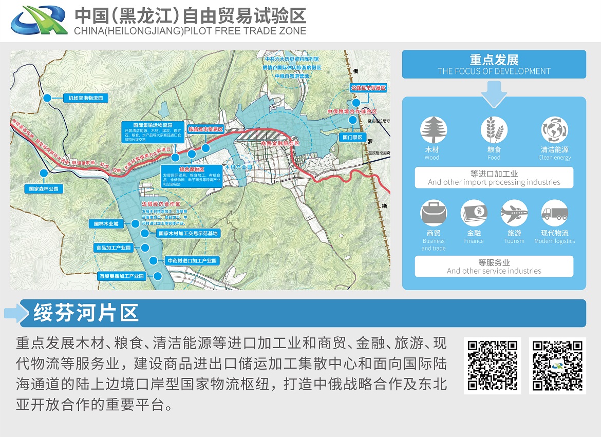 重點(diǎn)發(fā)展木材、糧食、清潔能源等進(jìn)口加工業(yè)和商貿(mào)金融、現(xiàn)代物流等服務(wù)業(yè),建設(shè)商品進(jìn)出口儲(chǔ)運(yùn)加工集散中心和面向國際陸海通道的陸上邊境口岸型國家物流樞紐,打造中俄戰(zhàn)略合作及東北亞開放合作的重要平臺(tái)。