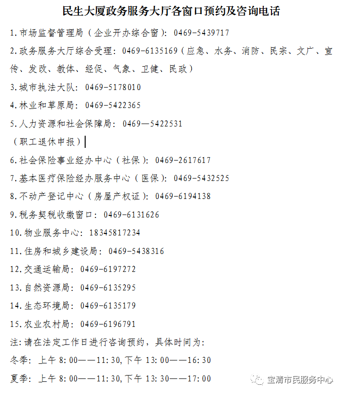 寶清縣政務(wù)服務(wù)中心投訴電話:6192855注:請?jiān)谥芤恢林芰▏曳ǘü?jié)假日除外)進(jìn)行咨詢預(yù)約,具體時(shí)間為:冬季:上午8:00——11:30,下午13:00——16:30夏季:上午8:00——11:30,下午13:30——17:00