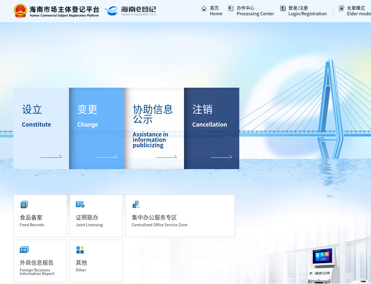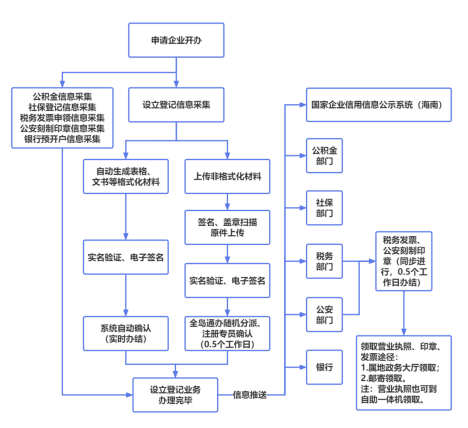 “海南市場(chǎng)主體登記平臺(tái)(海南e登記2.0)”(下文簡(jiǎn)稱“海南e登記2.0”平臺(tái)),整合企業(yè)設(shè)立登記業(yè)務(wù)、公安刻制印章、稅務(wù)發(fā)票申領(lǐng)、社保登記、公積金等各類開辦事項(xiàng)和銀行預(yù)開戶等服務(wù)資源,申請(qǐng)人只需要填寫一張表單、提交一次材料,就可實(shí)現(xiàn)市場(chǎng)主體快速開辦,無需在不同平臺(tái)或部門之間來回跑動(dòng),實(shí)現(xiàn)申請(qǐng)人可在一個(gè)窗口領(lǐng)取完?duì)I業(yè)執(zhí)照、公章和發(fā)票。