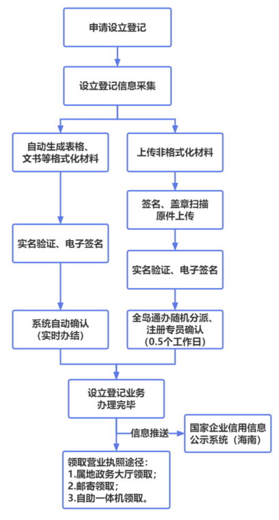 1、申請(qǐng)人可以通過“海南e登記2.0”平臺(tái)申請(qǐng)企業(yè)“設(shè)立登記”,同時(shí)采集公章刻制、銀行開戶(預(yù)約)、辦稅服務(wù)(申領(lǐng)發(fā)票)、員工參保登記、公積金單位繳存登記事項(xiàng)信息,在“設(shè)立登記”業(yè)務(wù)通過后同步推送至相對(duì)應(yīng)部門;