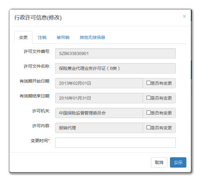 當行政許可信息發(fā)生變更(不包含注銷、吊銷信息)點擊“修改”按鈕選擇“變更”標簽頁,可對行政許可信息進行修改,默認情況各項信息不可編輯,勾選“是否有變更”選擇框可進行編輯,選擇變更日期后點擊“公示”按鈕可進行公示。