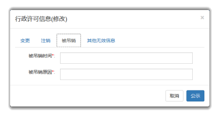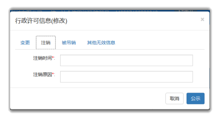 當行政許可信息注銷后需要添加注銷信息,點擊“修改”按鈕選擇“注銷”標簽頁,輸入注銷時間、注銷原因后點擊“公示”按鈕進行公示,公示成功后此行政許可信息狀態(tài)將變?yōu)椤盁o效”。