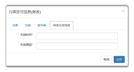 當行政許可信息因其他原因變?yōu)闊o效或因失誤填寫錯誤需要添加其他無效信息,點擊“修改”按鈕選擇“其他無效信息”標簽頁,輸入無效時間、無效原因后點擊“公示”按鈕進行公示,公示成功后此行政許可信息狀態(tài)將變?yōu)椤盁o效”。