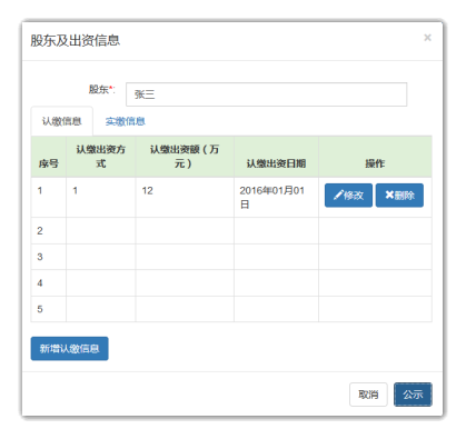 點擊“新增認繳信息”按鈕,彈出編輯窗口,如實填寫股東認繳信息。