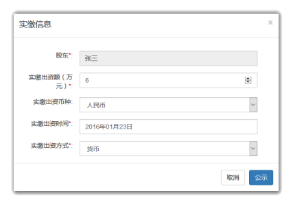 點擊“新增實繳信息”按鈕,彈出編輯窗口,如實填寫股東實繳信息。