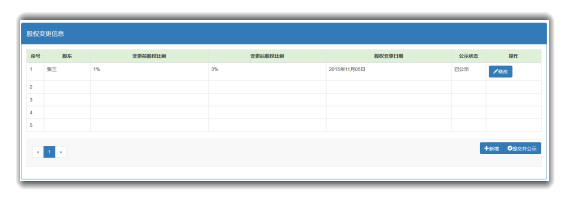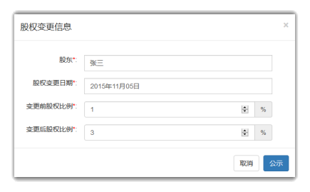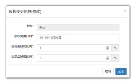 當股東股權變更信息在首次公示后再次發(fā)送變更后需要進行修改,點擊記錄“修改”按鈕,可修改除了股東姓名外的信息,確認無誤后點擊“公示”按鈕進行公示。