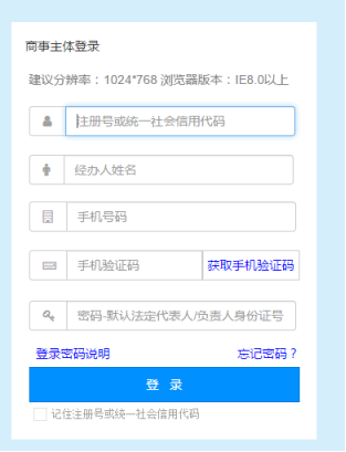在“商事主體登錄”頁面,輸入注冊號或統(tǒng)一社會信用代碼、經(jīng)辦人姓名、經(jīng)辦人手機號碼,在輸入完經(jīng)辦人手機號碼后點擊“獲取手機驗證碼”按鈕,獲得手機驗證碼后在“手機驗證碼”框中輸入驗證碼,最后輸入密碼(默認為法定代表人或負責人登記的身份證號碼,首次登陸需要進行修改)。