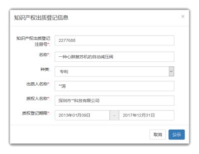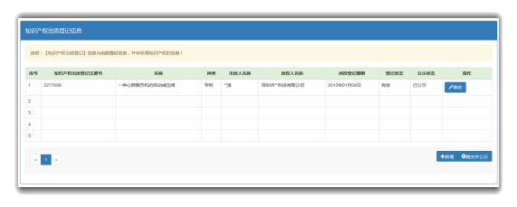 點擊“新增”按鈕,彈出編輯窗口,如實填寫知識產(chǎn)權出質(zhì)登記信息并保存。