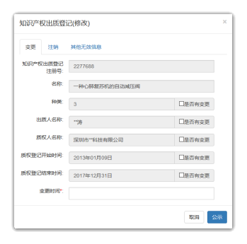 當知識產(chǎn)權出質(zhì)登記信息發(fā)生變更(不包含注銷、吊銷信息)點擊“修改”按鈕選擇“變更”標簽頁,可對知識產(chǎn)權出質(zhì)登記信息進行修改,默認情況各項信息不可編輯,勾選“是否有變更”選擇框可進行編輯,選擇變更日期后點擊“公示”按鈕可進行公示。