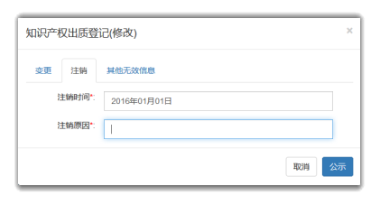當知識產(chǎn)權出質(zhì)登記信息注銷后需要添加注銷信息,點擊“修改”按鈕選擇“注銷”標簽頁,輸入注銷時間、注銷原因后點擊“公示”按鈕進行公示,公示成功后此知識產(chǎn)權出質(zhì)登記信息狀態(tài)將變?yōu)椤盁o效”。
