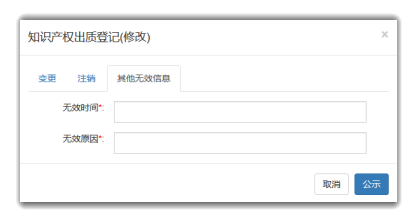 當知識產(chǎn)權出質(zhì)登記信息因其他原因變?yōu)闊o效或因失誤填寫錯誤需要添加其他無效信息,點擊“修改”按鈕選擇“其他無效信息”標簽頁,輸入無效時間、無效原因后點擊“公示”按鈕進行公示,公示成功后此知識產(chǎn)權出質(zhì)信息狀態(tài)將變?yōu)椤盁o效”。