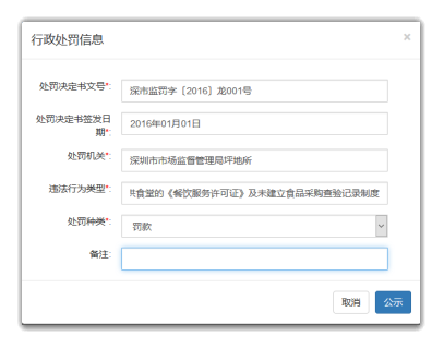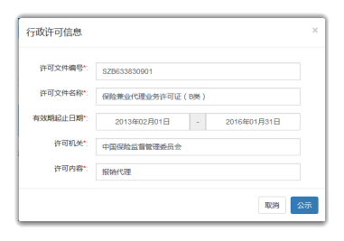 點擊“新增”按鈕,彈出編輯窗口,如實填寫行政許可信息,點擊下圖“公示”按鈕,保存成功后頁面自動關閉。