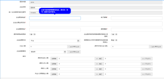 本頁填寫企業(yè)年報年度內(nèi)其基本信息,企業(yè)需要根據(jù)自己的實際情況如實填寫和選擇,其中“是否有網(wǎng)站和網(wǎng)店”、“企業(yè)是否有投資信息或購買其他公司股權”、“有限責任公司本年度是否發(fā)生股東股權轉(zhuǎn)讓”如果選擇“否”,則后面對應的標簽頁將隱藏。從業(yè)人數(shù)為必填項,企業(yè)可選擇是否公示。