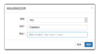 點擊“新增”按鈕,彈出編輯窗口,選擇類型“網(wǎng)站”或“網(wǎng)店”,再填寫網(wǎng)站或網(wǎng)店名稱,然后填寫網(wǎng)址(請輸入標準格式網(wǎng)址,已http://或https://開頭),最后點擊“保存”按鈕,保存成功后頁面自動關閉。