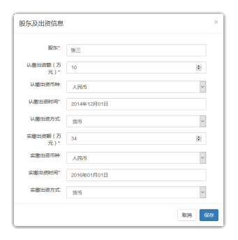 點擊“新增”按鈕,彈出編輯窗口。如實填寫股東及其出資信息后點擊“保存”按鈕,保存成功后本頁面將自動關閉。