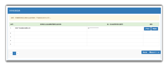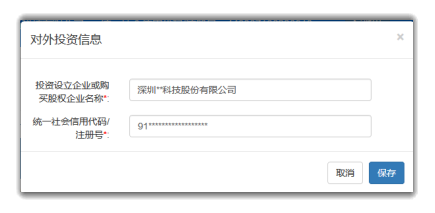 點擊“新增”按鈕,彈出編輯窗口。如實填寫對外投資信息后點擊“保存”按鈕,保存成功后本頁面將自動關閉。