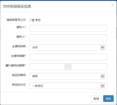 點擊“新增”按鈕,彈出編輯窗口,企業(yè)如實填寫年報年度內(nèi)企業(yè)對外提供保證擔保信息,點擊“保存”按鈕,成功后頁面自動關閉。
