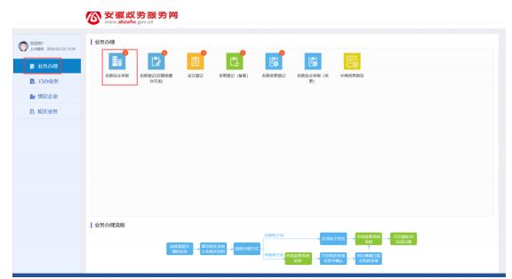1. 進(jìn)入系統(tǒng)頁(yè)面,選擇業(yè)務(wù)辦理里面的“名稱自主申報(bào)“選項(xiàng)。