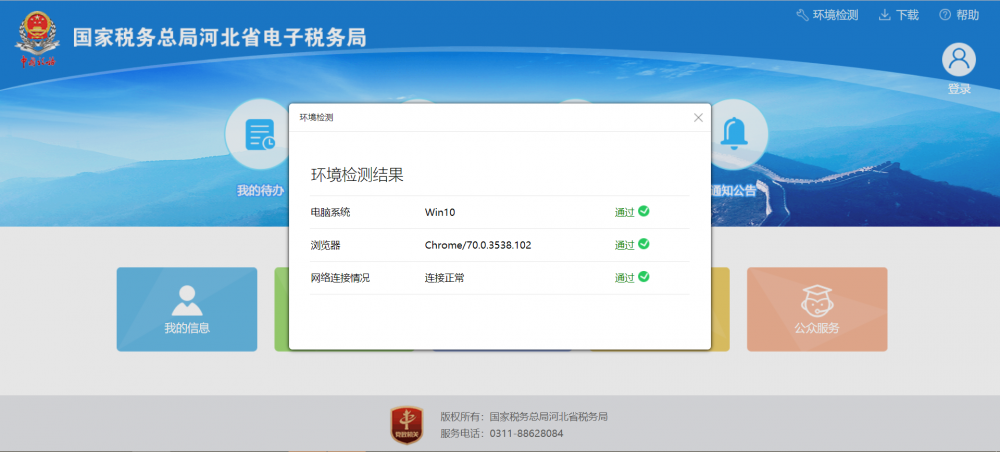 2、環(huán)境檢測:點擊電子稅務局首頁右上角“環(huán)境檢測”按鈕,可查看檢測結(jié)果。