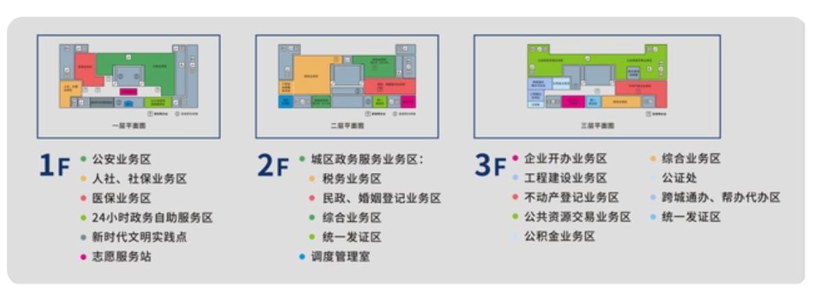 三樓:企業(yè)開辦、工程建設(shè)、不動(dòng)產(chǎn)登記、公共資源交易、公積金、綜合業(yè)務(wù)區(qū)、公證處、跨城通辦、幫辦代辦、統(tǒng)一發(fā)證區(qū)。