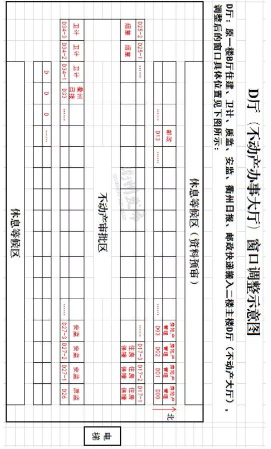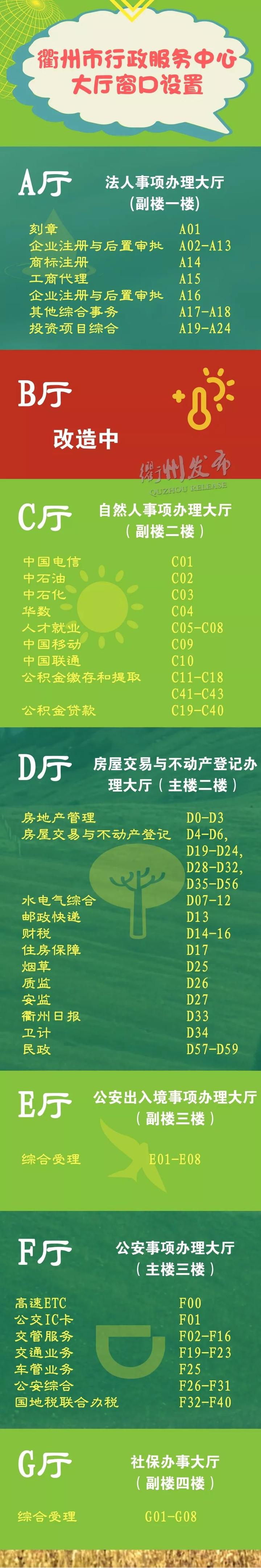 屆時,原在B廳辦理的相關事項(主要有:國地稅聯(lián)合辦稅、交通相關業(yè)務、住建相關業(yè)務、衛(wèi)計相關業(yè)務、質(zhì)監(jiān)、安監(jiān)、煙草、商標注冊、工商代理、刻章、衢州日報、郵政快遞等)將分流至A廳(一樓副樓:法人辦事大廳)、D廳(二樓主樓:不動產(chǎn)辦事大廳)、F廳(三樓主樓:公安辦事大廳)。
