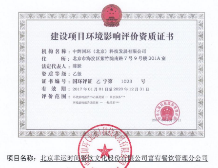 北京幸運(yùn)時(shí)間餐飲文化股份有限公司富宥餐飲管理分公司于 2016 年承租北京市西城 區(qū)宣武門(mén)外大街 32 號(hào) 1 幢 5 層原北京美富賈餐飲有限公司經(jīng)營(yíng)區(qū)域,對(duì)原有區(qū)域進(jìn)行裝 修改造,改造后餐飲經(jīng)營(yíng)面積為 1400 平方米,該公司于 2016 年 12 月 29 日取得了北京市 工商行政管局西城分局頒發(fā)的《營(yíng)業(yè)執(zhí)照》((91110102MA00AWBX9k),經(jīng)營(yíng)范圍為餐飲 管理、企業(yè)管理;組織文化藝術(shù)交流活動(dòng)(不含演出)。 項(xiàng)目所用房屋的所有權(quán)歸北京富卓創(chuàng)業(yè)房地產(chǎn)開(kāi)發(fā)有限公司所有,房屋用途為“商 業(yè)”,北京幸運(yùn)時(shí)間餐飲文化股份有限公司承租后無(wú)償提供給本項(xiàng)目使用。