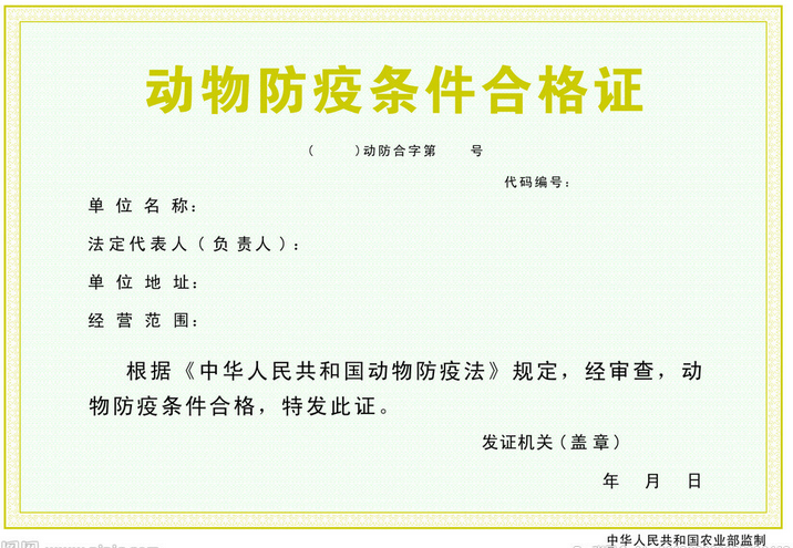 動物防疫條件合格證是單位和個人開辦動物飼養(yǎng)場、養(yǎng)殖小區(qū)、動物隔離場所、動物屠宰加工場以及動物和動物產(chǎn)品無害化處理場的生產(chǎn)經(jīng)營活動;經(jīng)獸醫(yī)管理部門審查,符合動物疫病預(yù)防、控制、撲滅等條件批準后,發(fā)給的動物防疫條件許可憑證。有注冊備案的許可證號。