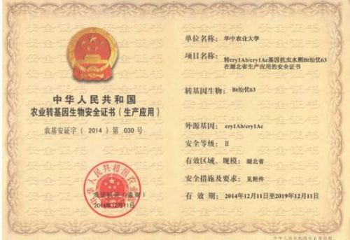 1999年,農(nóng)業(yè)部受理了華中農(nóng)業(yè)大學(xué)培育的兩種轉(zhuǎn)基因水稻(轉(zhuǎn)cry1Ab/cry1Ac基因抗蟲水稻"華恢1號(hào)"及雜交種"Bt汕優(yōu)63")的安全評(píng)價(jià)申請(qǐng),經(jīng)過(guò)11年的評(píng)價(jià),于2009年8月17日頒發(fā)了安全證書,有效期為五年;2014年8月17日,這兩張安全證書到期;如果安全證書續(xù)簽沒(méi)有成功,這些轉(zhuǎn)基因水稻的安全證書將過(guò)期作廢。